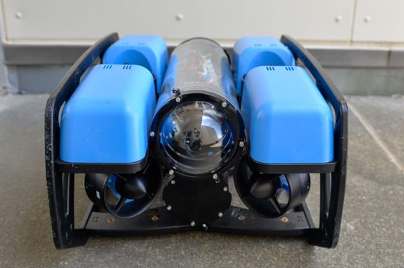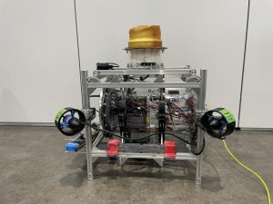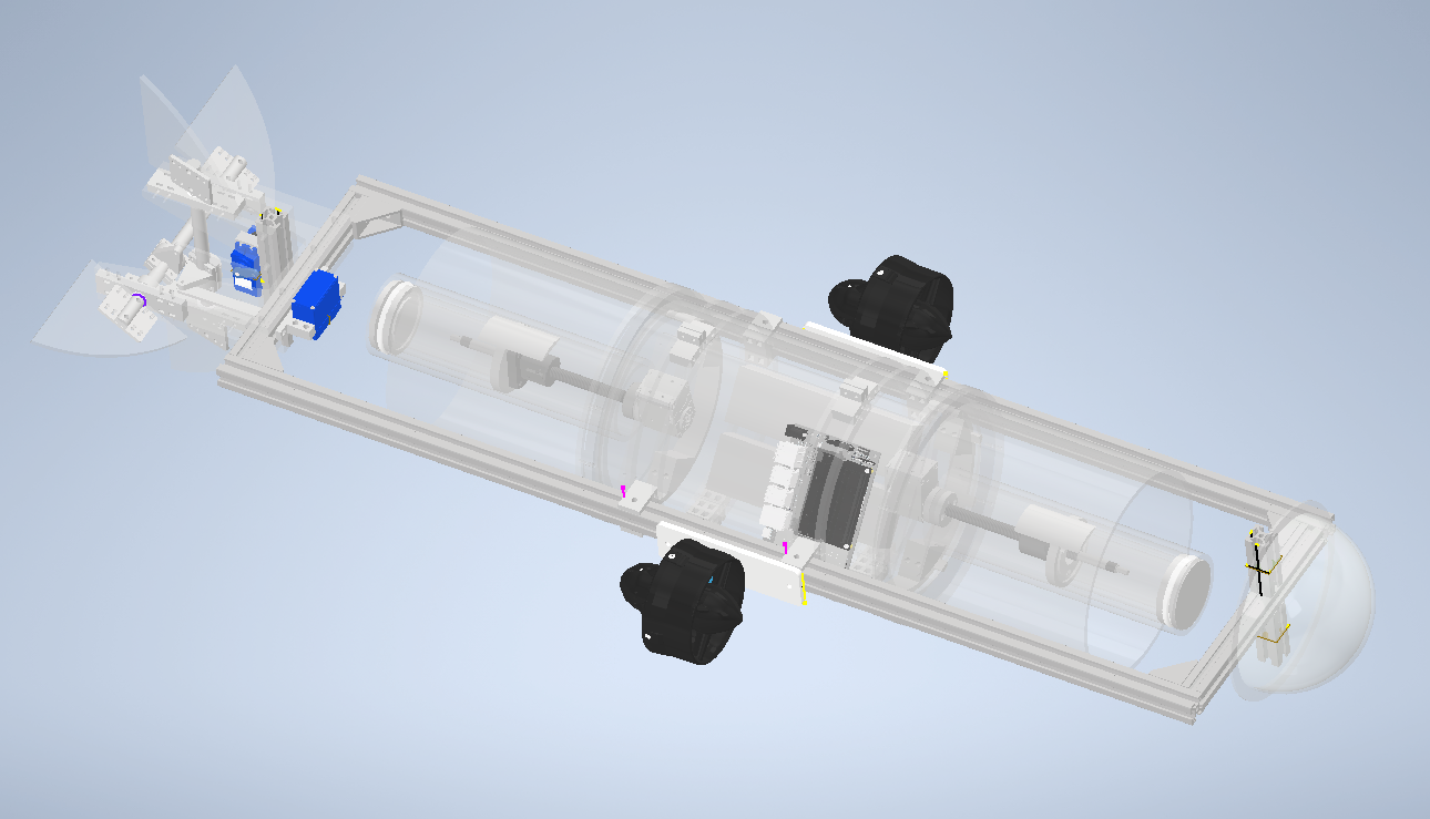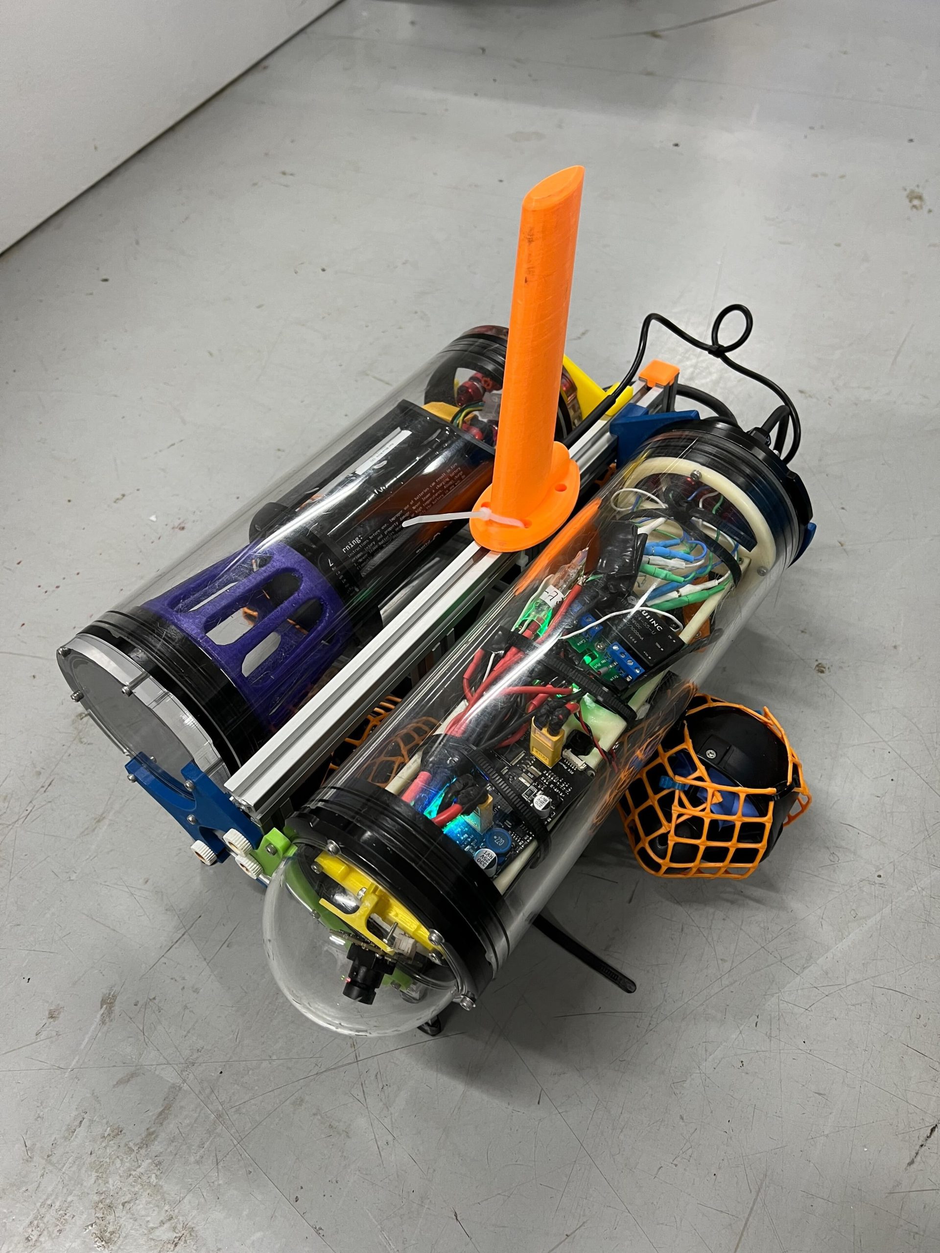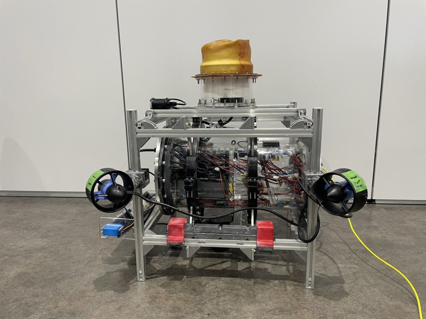 | ロボットは昨年の競技に参加したSebastianをベースにしています。2つのヒーブスラスターと2つのサージスラスターにより、4自由度(サージ、ヒーブ、ピッチ、ヨー)の制御が可能です。またセンサーとして、深度推定用の深度センサーと水中の風船を認識するためのカメラモジュールを取り付けています。昨年はカメラ画像にOpenCV Hough変換を用いることで物体認識を行っていましたが、今年は楕円あてはめやYOLOによる物体認識など複数の手法を試し、精度向上を目指す予定です。 制御にはRaspberry Pi 5とTeensyドライバーを使用します。Raspberry Pi上でロボット制御用の一般的なオープンソースツールであるRobot Operation System2 (ROS2)を使用し、TeensyドライバーでモータードライバーにPWM信号を送っています。 |